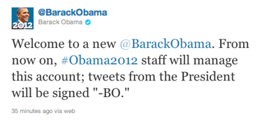 奧巴馬連任競選團(tuán)隊(duì)接管其Twitter和Facebook帳號,奧巴馬親自發(fā)布的Tweet將署有“-BO”字樣