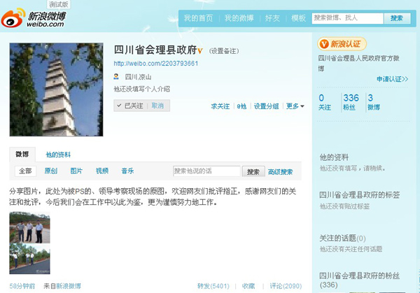 經(jīng)過認(rèn)證的名為“四川省會(huì)理縣政府”的微博于18點(diǎn)24分發(fā)布第一條微博,稱“由于我縣工作人員的失誤,在政府網(wǎng)站上發(fā)表了一張PS過的照片,他對于新聞?wù)鎸?shí)性的理解有誤,使得我縣在網(wǎng)絡(luò)上受到了更多的關(guān)注。在此,會(huì)理縣政府對于廣大網(wǎng)友的關(guān)注表示理解,并希望對此事道歉,并澄清。”