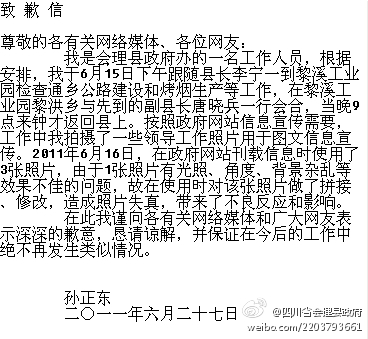 隨后,微博發(fā)布了署名“孫正東”的會(huì)理縣政府工作人員的道歉聲明,稱由于“照片光照、角度、背景雜亂等問題,在使用時(shí)對該張照片做了拼接、修改,造成照片失真”,并向媒體和網(wǎng)友道歉。
