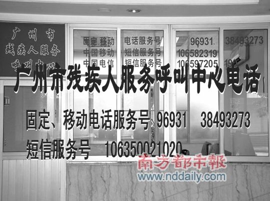 廣州市殘聯(lián)與中國(guó)移動(dòng)通訊廣州分公司合作建立的廣州市殘疾人服務(wù)呼叫中心(96931),可提供7x24小時(shí)的盲人語(yǔ)音短信、聾人短信緊急呼救、聾人短信中轉(zhuǎn)、殘疾人信息咨詢、電話聽新聞等服務(wù)。