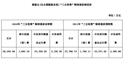 《銀監(jiān)會(huì)“三公經(jīng)費(fèi)”財(cái)政撥款情況表》反映銀監(jiān)會(huì)機(jī)關(guān)本級及2000多家各級派出機(jī)構(gòu)因公出國(境)費(fèi)、車輛購置及運(yùn)行費(fèi)和公務(wù)接待費(fèi)的財(cái)政撥款支出情況。