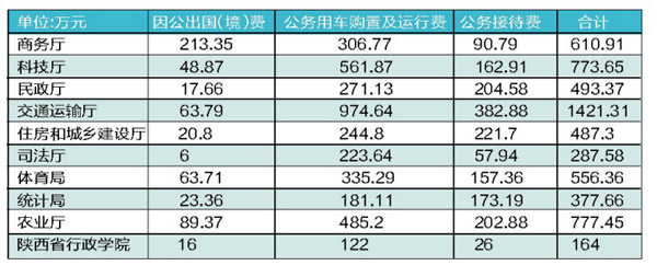 “三公”支出指因公出國(境)費(fèi)、公務(wù)用車購置及運(yùn)行費(fèi)和公務(wù)接待費(fèi)。在10部門中,支出最多的是省交通運(yùn)輸廳,三項(xiàng)支出分別為63.79萬元、974.64萬元、382.88萬元,總數(shù)1421.31萬元;陜西省行政學(xué)院支出最少,支出費(fèi)用分別是16萬元、122萬元、26萬元,合計(jì)164萬元。