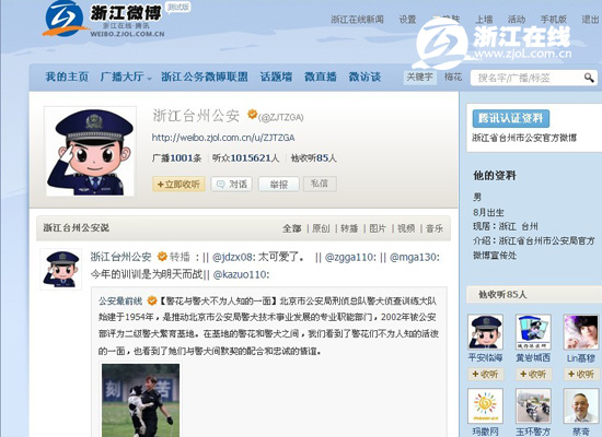 打開浙江微博,“浙江臺(tái)州公安”格外醒目,開通一年時(shí)間,聽眾粉絲已經(jīng)突破100萬。