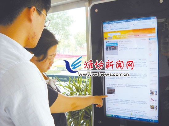 8月17日,上午記者來到奎文區(qū)大虞街道社區(qū)服務(wù)大廳,門口左側(cè)有臺近兩米高的信息機,走近一看碩大屏幕上顯示的是該街道的微博內(nèi)容,其中最新的一條信息是奎文區(qū)招聘人力資源和社會保障專管員的招聘簡章。