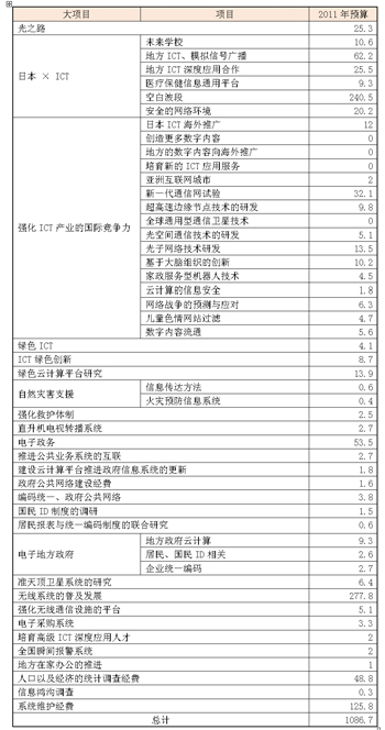 總務(wù)省提出2011年度預(yù)算案的信息通信項(xiàng)目總額1375億日元與2010年度相同。其中,ICT主要項(xiàng)目的總預(yù)算共有1086.7億日元(表1)。