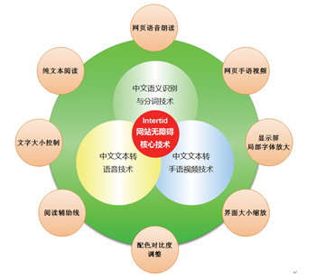 從目前信息無障礙應用技術的發(fā)展情況來看,網站無障礙化的技術主要組成部分見左下圖: