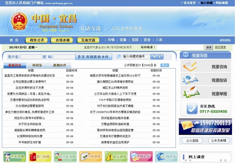 上什么網(wǎng)站?中國(guó)·宜昌門戶網(wǎng)站(www.yichang.gov.cn)是宜昌市人民政府對(duì)外的窗口,為廣大市民提供了信息公開(kāi)、在線辦事、互動(dòng)交流等多方面的服務(wù)。“政務(wù)公開(kāi)”頻道是市政府及其各部門政府信息公開(kāi)的第一平臺(tái),共有66個(gè)單位和部門通過(guò)該平臺(tái)及時(shí)公開(kāi)政府信息,主動(dòng)公開(kāi)的政府信息主要有機(jī)構(gòu)職能、規(guī)章文件、規(guī)劃計(jì)劃、應(yīng)急信息、人事信息、機(jī)關(guān)建設(shè)信息、各類工作信息和各類辦事信息等,到目前已經(jīng)主動(dòng)公開(kāi)3萬(wàn)余條信息;同時(shí)市民還可以通過(guò)“依申請(qǐng)公開(kāi)”方式獲取其他非主動(dòng)公開(kāi)信息。“在線辦事”頻道梳理了近300項(xiàng)市民26類和企業(yè)24類需要找政府辦理的事項(xiàng),每個(gè)事項(xiàng)包含了辦事規(guī)程、所辦事項(xiàng)狀態(tài)查詢,設(shè)置了咨詢和投訴,部分事項(xiàng)可以在線申請(qǐng)辦理。“互動(dòng)交流”頻道是政府聽(tīng)民聲、了民意、解民難的重要渠道,市民有訴求、有咨詢、有投訴都可以通過(guò)中國(guó)·宜昌門戶網(wǎng)站“互動(dòng)交流”頻道來(lái)注冊(cè)、提交、查詢;市直上線單位和部門有80多個(gè),可以在線接受市民各類訴求、咨詢和投訴,到目前通過(guò)該頻道辦理市民各類來(lái)信超過(guò)10萬(wàn)件,部門回復(fù)率、辦結(jié)率超過(guò)80%,市民滿意率超過(guò)85%.