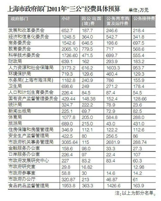 從市政府各部門公布的“三公”經(jīng)費預(yù)算的情況來看,僅2011年上海市人民政府研究室“三公”經(jīng)費預(yù)算“公務(wù)用車購置及運行費”一項并未有經(jīng)費的支出預(yù)算。2011年7月28日召開的市十三屆人大常委會二十八次會議上,市財政局局長蔣卓慶受市政府委托,作了《關(guān)于上海市2010年市本級決算及2011年上半年預(yù)算執(zhí)行情況的報告》。經(jīng)市財政局匯總,2011年本市市級行政單位、事業(yè)單位和其他的單位用財政撥款開支的“三公”經(jīng)費預(yù)算,合計11.1億元,其中,因公出國(境)經(jīng)費預(yù)算1.95億元、公務(wù)用車購置及運行費預(yù)算5.85億元、公務(wù)接待費預(yù)算3.3億元。有關(guān)本市市級部門“三公”經(jīng)費預(yù)算向社會公開工作參照中央做法辦理。蔣卓慶說,下一階段,本市各級財政部門將加強財政預(yù)算和決算管理,深化細化財政信息公開。