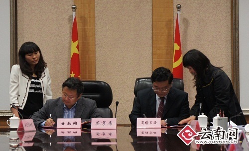 云南省政府研究室副主任孔燦和云南日報報業(yè)集團(tuán)副總編、云南網(wǎng)總編柴紅飚簽訂云南省諍言辦與云南網(wǎng)共建云南諍言網(wǎng)協(xié)議。