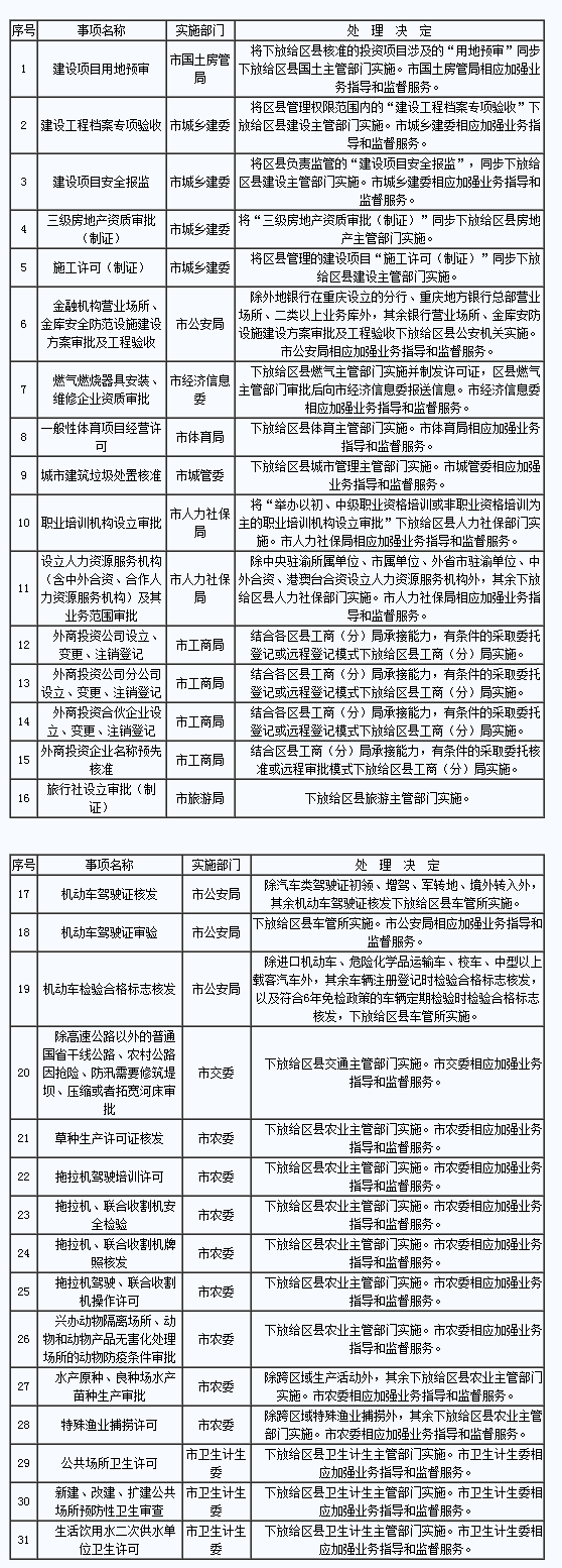 《決定》要求,各區(qū)縣政府、市政府有關部門和單位要加強組織領導,抓緊做好下放市級行政審批等管理事項的落實工作,進一步強化溝通協(xié)調(diào),加強事中事后監(jiān)管。市政府有關部門行政審批等管理事項要應放盡放,嚴禁截留,不得出現(xiàn)放權不協(xié)同、不配套等問題;對下放事項要進一步明晰市、區(qū)縣權限,同時加強對承接單位的培訓和指導,完善銜接措施,確保平穩(wěn)有序過渡。各區(qū)縣政府要盡快制定具體承接辦法,明確承接機構,落實承接措施,確保及時有效承接到位。