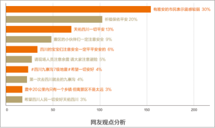 經(jīng)分析,在該條微博下,40%的網(wǎng)友留言為四川災(zāi)區(qū)祈福,希望“天佑四川一切平安”;30%的網(wǎng)友留言稱“有雅安的市民表示震感較弱”;15%的網(wǎng)友提醒“四川的小伙伴一定注意安全”;5%的網(wǎng)友希望現(xiàn)場人員可以注意余震;4%的網(wǎng)友表示自己去過九寨溝;3%的網(wǎng)友表示震中離景區(qū)很近?!捌桨病币辉~成為這一單條微博評論中被提及最高的詞匯,達(dá)37.3萬次;其次則是“四川”和“保佑”“天佑”。