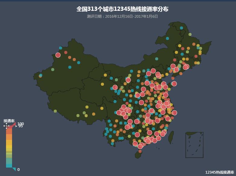 按照《規(guī)范》的標(biāo)準(zhǔn),將接通率在95%以上的政府熱線定為達(dá)標(biāo)“熱線”,同時(shí),根據(jù)不同接通率分布將各地?zé)峋€分為:“溫線”(接通率31%-94%)、“冷線”(接通率1%-30%)及“死線”(接通率0%)。