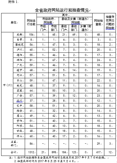 ?。ㄒ唬┤≌W(wǎng)站抽查情況。截至2017年9月7日,全省正在運(yùn)行的政府網(wǎng)站1312個。其中,省直部門網(wǎng)站86個,市級政府門戶網(wǎng)站21個,市級部門網(wǎng)站898個,縣級政府門戶網(wǎng)站184個,縣級部門網(wǎng)站123個。省政府辦公廳組織隨機(jī)抽查并人工復(fù)核417個,總體合格率97.1%。其中,成都、甘孜等15個市(州)政府網(wǎng)站抽查合格率為100%;成都、遂寧、樂山、南充、廣安、巴中、雅安和眉山等8個市(州)連續(xù)三個季度抽查合格率達(dá)100%。