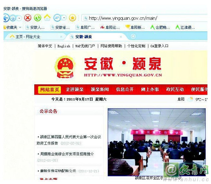 記者隨即打開潁泉區(qū)政府網(wǎng),發(fā)現(xiàn)劉先生反映的問題屬實(shí)。記者在網(wǎng)站首頁上看到,雖然上面顯示“今天是2011年9月17日星期六”,但《公示公告》、《今日潁泉》等欄目中顯示的信息,標(biāo)注日期已到2012年2月份。