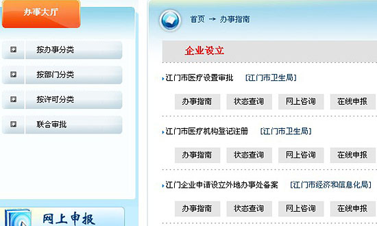廣東省網(wǎng)上辦事大廳江門分廳已基本建成。該分廳的同志介紹,該市已經(jīng)將各個(gè)職能部門的網(wǎng)上審批統(tǒng)一到一個(gè)辦事平臺(tái)上。譬如某人要開設(shè)公司,要經(jīng)過工商、衛(wèi)生等多個(gè)部門的審批,他可以在辦事大廳的聯(lián)合審批平臺(tái)上一次性提交所有資料,各個(gè)部門在后臺(tái)分別審批,待審批都完成,他就可以領(lǐng)證開店,全程幾乎不用跑任何部門。