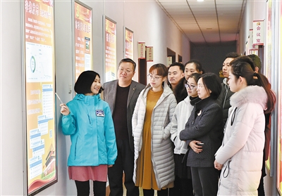 2017年12月27日,在辛集市委宣傳部,工作人員沈艷云(左一)正為參觀者介紹“辛集發(fā)布”政務(wù)微信平臺(tái),分享工作經(jīng)驗(yàn)。 記者霍艷恩攝