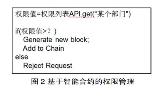 3.基于智能合約的權(quán)限管理和交易規(guī)則?;谥悄芎霞s,數(shù)據(jù)權(quán)限管理和交易規(guī)則可通過鏈上編碼實(shí)現(xiàn),在交易過程中自動執(zhí)行,不需要人為干涉,實(shí)時(shí)在線地保證數(shù)據(jù)操作的合法、合理、合規(guī)性。例如:在多個(gè)部門共享數(shù)據(jù)模型中,每個(gè)部門都通過共享出自己的數(shù)據(jù)(數(shù)據(jù)類型、數(shù)據(jù)量、更新頻率等)獲得積分(具體積分機(jī)制需要商定),我們可以簡單地定義為,積分更高就能有更高的權(quán)限請求和使用其他部門的數(shù)據(jù),權(quán)限值達(dá)到了,請求操作的數(shù)據(jù)區(qū)塊便可自動生成,協(xié)議生效,不需要人工干預(yù),從而提升了效率。如圖2所示。