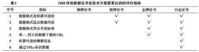 ODM的子項目,英國開放數(shù)據(jù)研究所(Open Data Institute,ODI)開發(fā)和維護的在線工具“開放數(shù)據(jù)證書”(certificates.theodi.org),則是通過收集每個數(shù)據(jù)集的DCAT(Data Catalog Vocabulary)元數(shù)據(jù)評價其質(zhì)量和可信度,評價結(jié)果從低到高分為四類證書:銅牌、銀牌、金牌和白金證書。項目考察開放數(shù)據(jù)集的法律、技術(shù)、社會和實踐四個方面的23個指標,“機器可讀的溯源信息”是技術(shù)方面的6個指標之一,見表1。級別越高要求達到的指標越多,“溯源”是最高級別的“白金證書”所必需的。