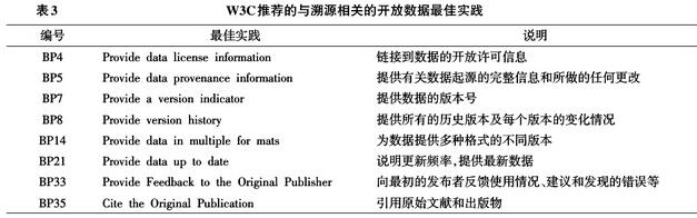 2016年8月30日,DWBP工作組的主要成果——在Web中發(fā)布數(shù)據(jù)的最佳實踐,成為W3C的候選標準[15]。工作組為開放數(shù)據(jù)推薦了35個最佳實踐(Best Practice,BP),其中19個有助于提升數(shù)據(jù)的可信度,而與溯源相關(guān)的最佳實踐有8個,見表3。