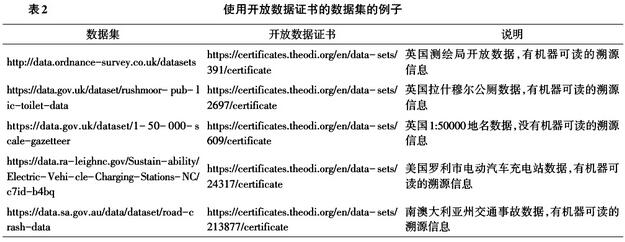 2013年11月1日頒布的《G8開放數(shù)據(jù)憲章英國國家行動計劃》規(guī)定NⅡ中的開放數(shù)據(jù)集要經(jīng)歷“開放數(shù)據(jù)證書”的評估過程。美國和澳大利亞等國的開放數(shù)據(jù)門戶網(wǎng)站也采納了這項評估,用以向用戶推薦數(shù)據(jù)集。表2給出了來自三個國家的5個數(shù)據(jù)集的例子,它們均是銀牌證書,其中4個有機器可讀的溯源信息,1個沒有。