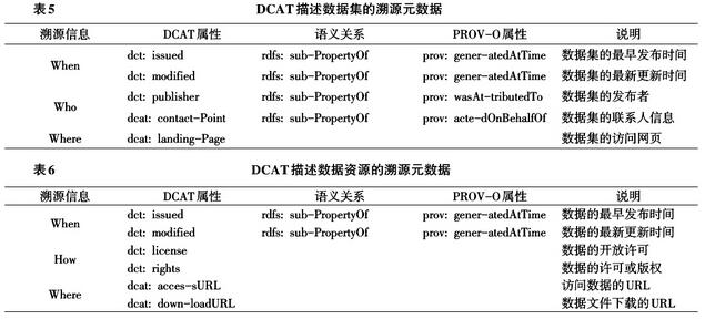 綜合表5和表6,DCAT中的溯源信息涵蓋四個方面:When、Who、Where和How。同DC中的溯源信息相比[8],多了Where方面的三個元數(shù)據(jù)項,滿足了開放數(shù)據(jù)“到哪里找到數(shù)據(jù)”的需求。