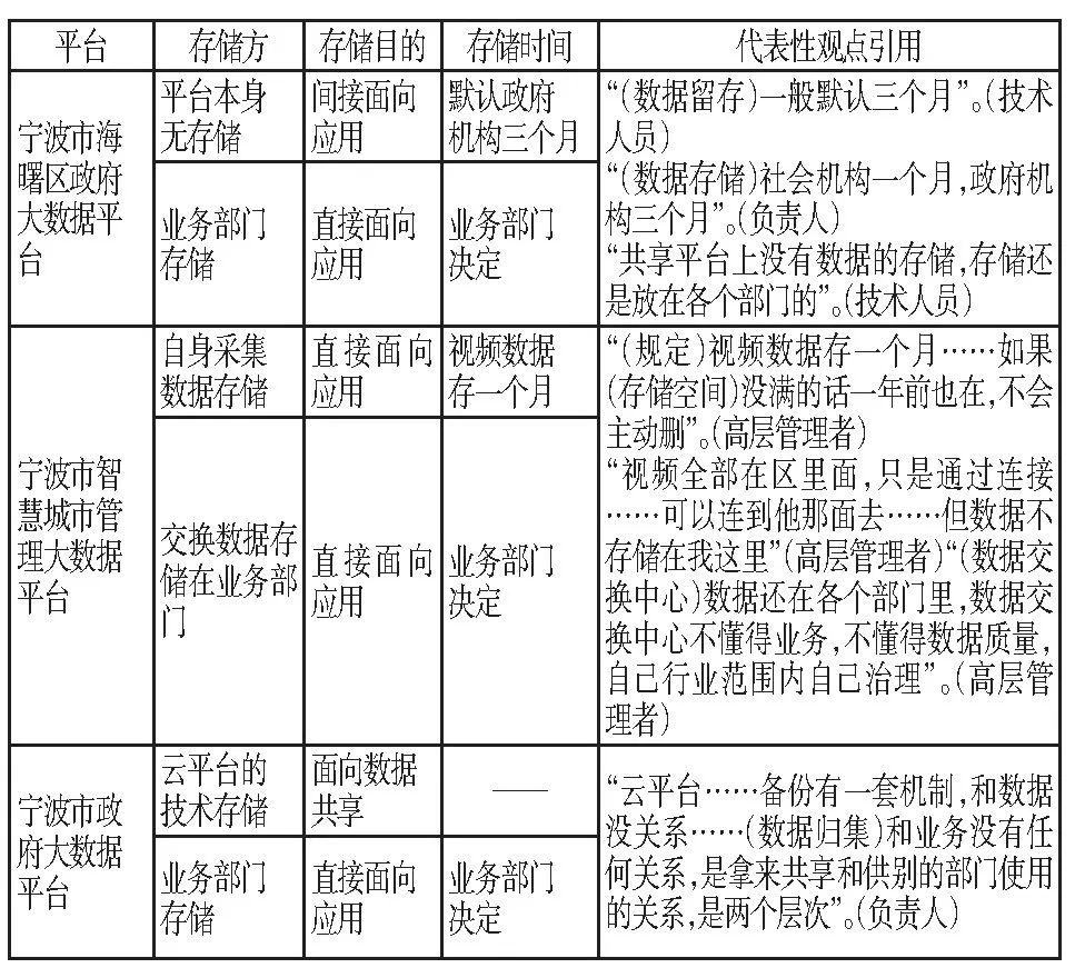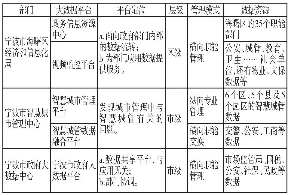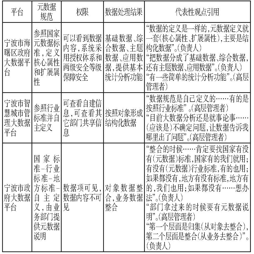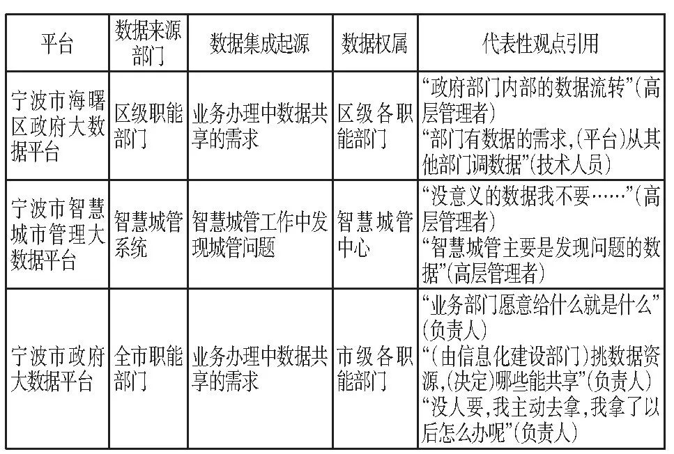 本研究調(diào)研的寧波市三個政府部門建立的大數(shù)據(jù)平臺, 均為政府部門內(nèi)部為促進數(shù)據(jù)流轉(zhuǎn)建立的跨系統(tǒng)和跨部門的大數(shù)據(jù)平臺。表1總結(jié)了三個案例的特點。