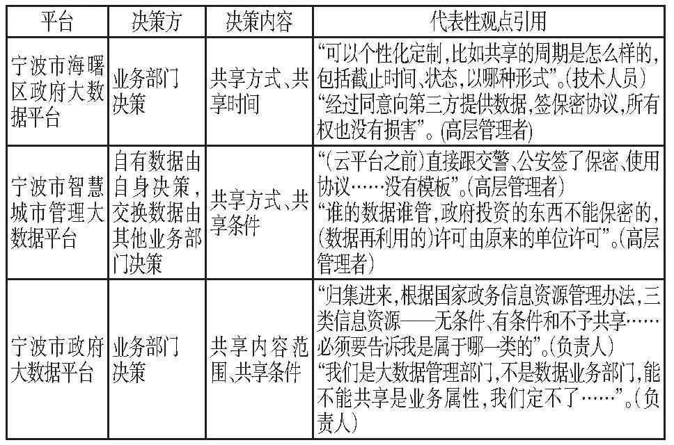 上述分析表明, 與現(xiàn)有文獻研究的主流觀點相反, 政府跨部門數(shù)據(jù)共享的影響因素眾多, 但由于存在業(yè)務需求, 各業(yè)務部門對數(shù)據(jù)共享表示支持, 而非各部門不愿共享數(shù)據(jù)。同時寧波市三個跨系統(tǒng)跨部門的政府大數(shù)據(jù)平臺數(shù)據(jù)共享的經(jīng)驗揭示, 將數(shù)據(jù)共享的決策權(quán)保留在業(yè)務部門, 以減少業(yè)務部門數(shù)據(jù)共享的顧慮是有效的大數(shù)據(jù)平臺數(shù)據(jù)共享路徑。