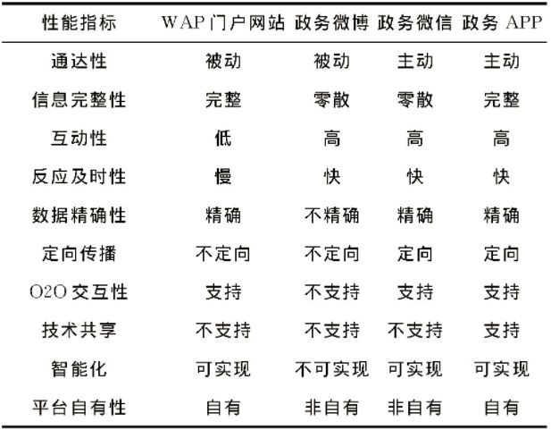 綜合學(xué)界對(duì)于移動(dòng)政務(wù)平臺(tái)研究的學(xué)術(shù)觀點(diǎn),結(jié)合費(fèi)軍等人政務(wù)平臺(tái)實(shí)用性研究成果,以WAP門戶網(wǎng)站、政務(wù)微博、政務(wù)微信、政務(wù)APP為代表來(lái)對(duì)比分析各政務(wù)平臺(tái)的性能特點(diǎn)。我們綜合選取了10種共3類性能指標(biāo),即基本服務(wù)功能要求指標(biāo)(通達(dá)性、信息完整性、互動(dòng)性、反應(yīng)及時(shí)性)、智能化服務(wù)性能指標(biāo)(數(shù)據(jù)精確性、定向傳播、O2O交互性)、擴(kuò)展服務(wù)性能指標(biāo)(技術(shù)共享、智能化、平臺(tái)自有性)來(lái)進(jìn)行對(duì)比,以此展示各移動(dòng)政務(wù)平臺(tái)的性能(見表1)。