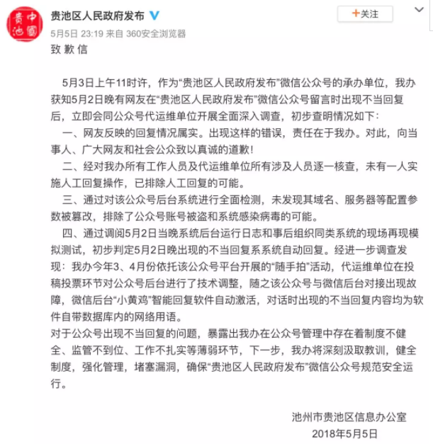 貴池區(qū)信息辦表示,公眾號(hào)出現(xiàn)不當(dāng)回復(fù)暴露出其在公眾號(hào)管理中存在著制度不健全、監(jiān)管不到位、工作不扎實(shí)等薄弱環(huán)節(jié),下一步將深刻汲取教訓(xùn),健全制度,強(qiáng)化管理,堵塞漏洞,切實(shí)加強(qiáng)政務(wù)新媒體建設(shè)與管理,努力辦好“貴池區(qū)人民政府發(fā)布”微博微信工作。