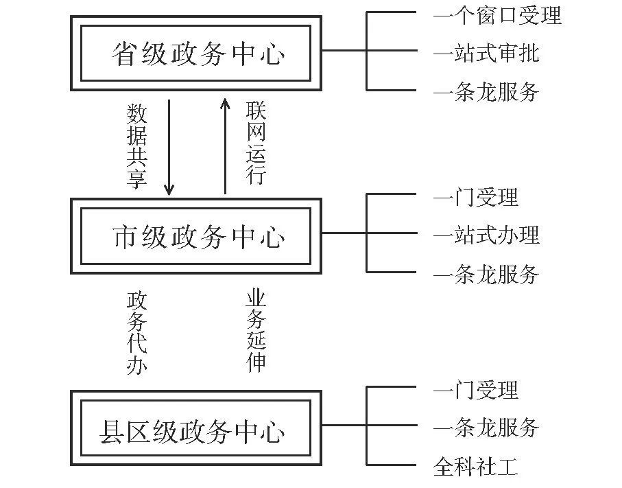 二是建立線下運(yùn)營模式。線下布局就是在各個(gè)地區(qū)建立各級(jí)的政務(wù)中心, 以網(wǎng)絡(luò)平臺(tái)為基礎(chǔ), 以具體便民業(yè)務(wù)為抓手, 有效提升了政府工作效率和政府為民服務(wù)的能力, 按照行政區(qū)域的劃分, 我國政務(wù)中心可以分為省級(jí)、市級(jí)、縣區(qū)級(jí)三個(gè)級(jí)別, 把打造集行政審批、電子監(jiān)察、績(jī)效管理、便民服務(wù)等功能為一體的政務(wù)平臺(tái)為努力方向, 實(shí)現(xiàn)網(wǎng)上窗口與審批系統(tǒng)、監(jiān)察系統(tǒng)的有效銜接和跟進(jìn)數(shù)據(jù)同步, 充分利用大數(shù)據(jù)的優(yōu)勢(shì)強(qiáng)化政府效能。具體構(gòu)建如圖6所示。