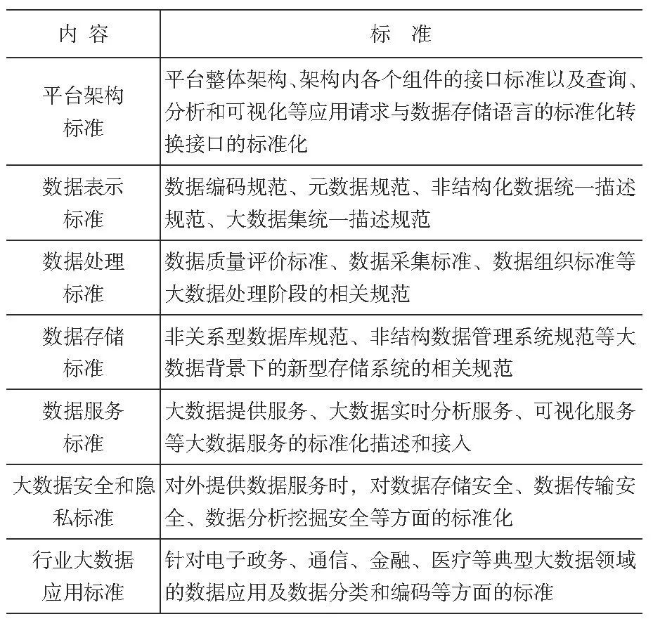 三是制定統(tǒng)一的數(shù)據(jù)規(guī)范標(biāo)準(zhǔn)。目前, 我國政府?dāng)?shù)據(jù)開放門戶網(wǎng)站以及相關(guān)的軟件和技術(shù)都是政府采購, 各個(gè)廠商之間自主開放, 各個(gè)部門自主進(jìn)行選擇, 這就會(huì)導(dǎo)致數(shù)據(jù)的格式和技術(shù)標(biāo)準(zhǔn)上的不統(tǒng)一。因此, 必須建立規(guī)范的數(shù)據(jù)標(biāo)準(zhǔn)和統(tǒng)一數(shù)據(jù)口徑, 具體構(gòu)建標(biāo)準(zhǔn)見表1。