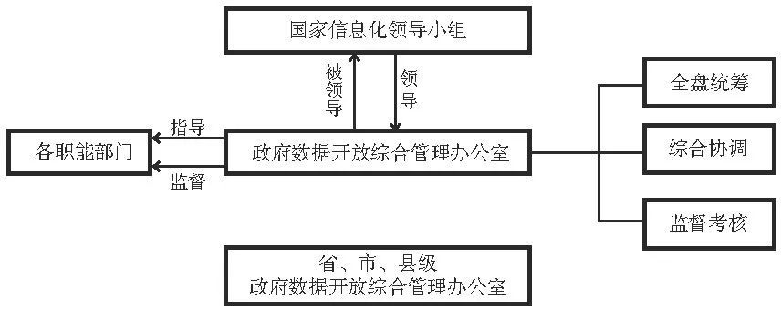 在中央政府?dāng)?shù)據(jù)開放綜合管理辦公室的領(lǐng)導(dǎo)下, 在省、市、縣三個(gè)地方層級(jí)設(shè)置數(shù)據(jù)開放綜合管理辦公室, 形成從中央到地方層層落實(shí)精神、明確職責(zé), 同時(shí), 指導(dǎo)并監(jiān)督同級(jí)其他部門的數(shù)據(jù)開放工作。