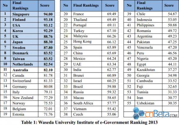日本早稻田大學(xué)所做的全球電子化政府排名是以全球55個(gè)國家/地區(qū)為對象,從網(wǎng)絡(luò)完整度、網(wǎng)站界面功能、管理優(yōu)化、國家入口網(wǎng)、政府CIO、信息化政府營銷、信息化參與共7大項(xiàng)標(biāo)準(zhǔn)進(jìn)行評分,依評分決定各國排名表現(xiàn)。