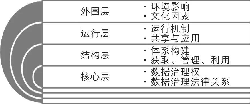 外圍層:互聯(lián)網(wǎng)時代政府?dāng)?shù)據(jù)治理系統(tǒng)的外部環(huán)境和文化因素對政府治理的影響, 營造符合數(shù)據(jù)治理文化的外部支撐環(huán)境。