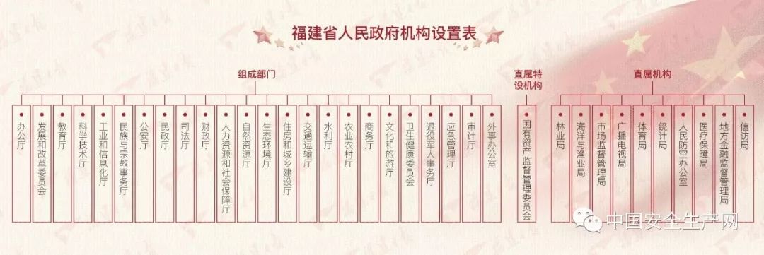 《福建省省級機構(gòu)改革實施方案》明確,福建省省級共設(shè)置黨政機構(gòu)60個。黨委機構(gòu)19個,其中,紀(jì)檢監(jiān)察機關(guān)1個,工作機關(guān)15個,工作機關(guān)管理的機關(guān)3個。政府機構(gòu)41個,其中,省政府辦公廳和組成部門24個,直屬特設(shè)機構(gòu)1個,直屬機構(gòu)10個,部門管理機構(gòu)6個。
