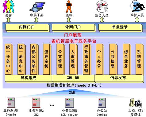綜上所述,我們看到整合型電子政務(wù)平臺擁有如下的技術(shù)特點(diǎn),從而為大跨度、多數(shù)據(jù)源、新應(yīng)用的政務(wù)工作提供堅(jiān)實(shí)保障。平臺采用純J2EE架構(gòu),使用Java技術(shù)及中間件技術(shù)實(shí)現(xiàn);B/S架構(gòu)完全支持IE、Netscape等通用的瀏覽器;原生XML數(shù)據(jù)庫實(shí)現(xiàn)了對XML交換格式數(shù)據(jù)的直接存儲和高性能檢索功能;企業(yè)信息集成(EII)軟件中間件,實(shí)時(shí)集成和整合異構(gòu)信息,包括各種異構(gòu)的數(shù)據(jù)庫、結(jié)構(gòu)化半結(jié)構(gòu)化文檔、網(wǎng)頁和應(yīng)用系統(tǒng);基于目錄服務(wù)(LDAP)技術(shù)的組織機(jī)構(gòu)、崗位分工、職權(quán)匹配、用戶權(quán)限等管理為職責(zé)明確和協(xié)同工作提供便利;同時(shí)界面的美觀大方、人性化,使操作簡單、便捷;知識庫的功能充分發(fā)揮了知識的重用性,為省機(jī)管局建立知識型單位做積累。