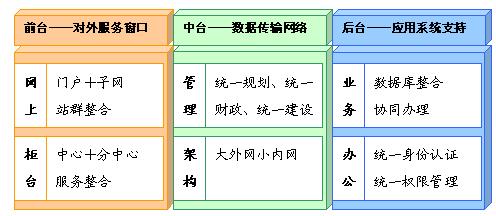 “后臺”是政府辦公辦事的各種應(yīng)用支持系統(tǒng)。通過統(tǒng)一公務(wù)員辦公門戶、統(tǒng)一用戶身份認證、統(tǒng)一用戶權(quán)限管理、統(tǒng)一郵件系統(tǒng)管理、統(tǒng)一標準的電子檔案存儲,將直接提升政府辦公效率、降低政府運營成本,進而實現(xiàn)真正意義上的電子政府。