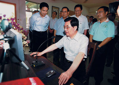 4月9日,胡錦濤總書(shū)記在海南三亞視察社會(huì)主義新農(nóng)村建設(shè)時(shí),來(lái)到信息化示范村——鳳凰鎮(zhèn)檳榔村。他通過(guò)中國(guó)電信海南公司提供的高速率網(wǎng)絡(luò)視頻,與省農(nóng)業(yè)科技服務(wù)110專家對(duì)話,關(guān)切地詢問(wèn)農(nóng)產(chǎn)品的銷路和價(jià)格,了解瓜菜的市場(chǎng)情況。視頻網(wǎng)絡(luò)清晰的語(yǔ)音和圖像,給人們留下深刻的印象。