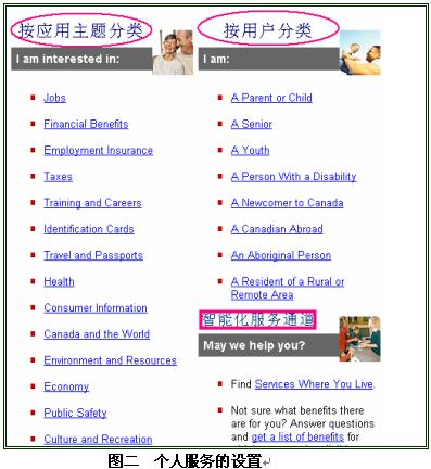 加拿大政府網(wǎng)站以用戶分類為基礎(chǔ),圍繞用戶需求進(jìn)行網(wǎng)站組織構(gòu)建。它針對某一特定用戶或主題,將不同部門提供的相關(guān)服務(wù)整合到一起,從而區(qū)別于以部門職能為基礎(chǔ)、在各部門下分開設(shè)置相關(guān)服務(wù)主題的網(wǎng)站組織形式,突破了政府部門的職能界限。