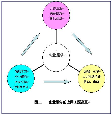 具體各主題下,服務(wù)內(nèi)容大致包括:對該主題在線服務(wù)的介紹、該主題業(yè)務(wù)的基礎(chǔ)知識、政府為該業(yè)務(wù)提供的服務(wù)、業(yè)務(wù)引導(dǎo)等幾個部分。如圖三所示,通過這種設(shè)置,本欄目為用戶構(gòu)建了一套圍繞企業(yè)經(jīng)營運作相對完整的服務(wù)體系。同時它還就政府采購、企業(yè)團(tuán)體協(xié)會等進(jìn)行介紹,促進(jìn)政府與企業(yè)間業(yè)務(wù)上的互動。