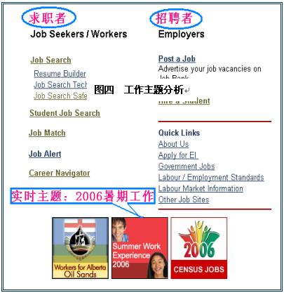 針對求職者,它設(shè)置了“尋找工作”、“學(xué)生尋找工作”、“工作匹配”、“求職提醒”、“職業(yè)導(dǎo)航”五個欄目,提供的服務(wù)內(nèi)容全面周到、細(xì)致入微。如“尋找工作”這一子主題,除了為用戶提供網(wǎng)上發(fā)布的相關(guān)招聘信息之外,還對求職者在簡歷制作、求職技巧、求職安全等多方面提供了周到的服務(wù),一切以用戶在求職過程中的需求為中心來組織服務(wù)項目。同時,“工作”欄目還設(shè)置了一些時效性很強的服務(wù)主題,以滿足用戶在不同時期的需要。如進(jìn)入暑期,網(wǎng)站特別開設(shè)了“2006暑期工作經(jīng)歷”專題,為學(xué)生用戶在暑期尋找工作提供全方位的服務(wù)。