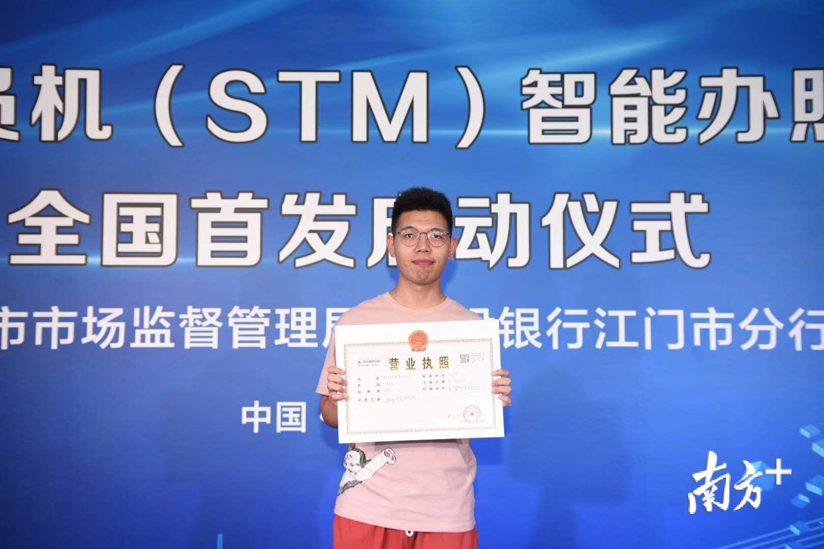 人臉識(shí)別、自主申報(bào)、智能審批、自助打照,辦理營(yíng)業(yè)執(zhí)照全程用時(shí)僅5分鐘!7月26日,在建行廣東江門(mén)分行營(yíng)業(yè)大廳,江門(mén)市蓬江區(qū)槿木軒花卉設(shè)計(jì)店經(jīng)營(yíng)者黃毓軒領(lǐng)取了全國(guó)首張STM智慧柜員機(jī)智能辦照系統(tǒng)辦理的營(yíng)業(yè)執(zhí)照。
