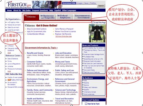 美國“第一政府”門戶網(wǎng)站是世界上最早建立的政府門戶網(wǎng)站之一,也是世界上功能最完善、服務(wù)最豐富的政府門戶網(wǎng)站之一?!暗谝徽遍T戶網(wǎng)站的設(shè)計(jì)較好地體現(xiàn)了“以公眾為中心”這一理念(詳見圖4)。“第一政府”首頁上占據(jù)面積最大的不是政府新聞,而是關(guān)于公共服務(wù)的鏈接和指示。按不同的用戶群將服務(wù)劃分為四類:針對公眾的、針對企業(yè)及非營利機(jī)構(gòu)的、針對聯(lián)邦政府職員的和針對政府部門的。用戶可以依照這一分類對號入座。首頁右側(cè),為特殊人群開設(shè)了專門的服務(wù)通道,這些特殊人群分別是兒童、父母、老人、軍人、西班牙語用戶和海外人士。首頁的正中則依據(jù)主體對政府信息和服務(wù)進(jìn)行了劃分,包括福利和救助、就業(yè)和教育、消費(fèi)者指導(dǎo)、金融和繳稅等。通過這樣的設(shè)計(jì),用戶可以不費(fèi)力氣地找到自己所需的服務(wù)。美國政府要求,網(wǎng)站的設(shè)計(jì)要使得用戶最多點(diǎn)擊三次鼠標(biāo)就能找到所需服務(wù),這正是“以公眾為中心”這一理念的真正體現(xiàn)。