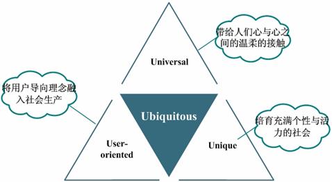這里主要介紹“u-Japan”中對于“無處不在”的論述?!皍-Japan”中的理念可以概括為1個(gè)大“U”和3個(gè)小“U”。大“U”,即無處不在(Ubiquitous),其核心是基礎(chǔ)設(shè)施建設(shè),通過技術(shù)發(fā)展引導(dǎo)和帶動基礎(chǔ)設(shè)施建設(shè),并以泛在基礎(chǔ)設(shè)施環(huán)境連接所有的人和物,構(gòu)筑任何時(shí)間、任何地點(diǎn)、任何人都可以方便地上網(wǎng)辦理任何事務(wù)的環(huán)境。第一個(gè)小“U”,即大眾普及(universal),主張通過推廣普及性的設(shè)計(jì)理念,實(shí)現(xiàn)普遍服務(wù)。第二個(gè)小“U”,即用戶導(dǎo)向(user-oriented),主張通過貫徹“用戶至上”的觀點(diǎn),實(shí)現(xiàn)“用戶導(dǎo)向融合型社會”。第三個(gè)小“U”,即獨(dú)具特色(unique),主張通過充分發(fā)揮信息技術(shù)的潛力,培育充滿個(gè)性與活力的社會(詳見圖5)。