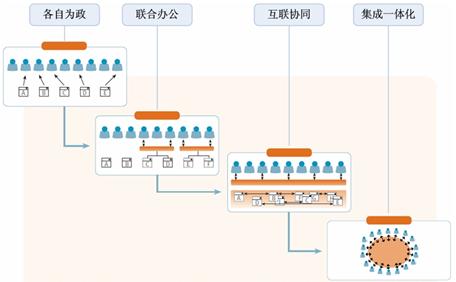 這一理念代表了我們所理解的電子政務(wù)公共服務(wù)發(fā)展的高級境界。在服務(wù)的前臺,公眾獲得的是“集成的服務(wù)”,即公眾可以通過統(tǒng)一的渠道和界面獲得公共服務(wù);在服務(wù)的后臺,服務(wù)的提供是跨越部門界限的,是能夠協(xié)同辦公的。因而,“集成的政府”是在實(shí)現(xiàn)了政府互聯(lián)以及服務(wù)集成之后的新超越。“集成的政府”這一理念的提出,標(biāo)志著以新加坡為代表的電子政務(wù)領(lǐng)先國家的電子政務(wù)建設(shè)重點(diǎn)正在從前臺向后臺轉(zhuǎn)移。通過圖8能更好地理解“集成的政府”所蘊(yùn)含的政府公共服務(wù)提供方式的變化。