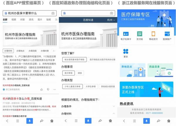 2019年8月,“百度政務千城計劃”落地浙江,與“浙里辦”共同建設浙江省在線政務,目前,浙江省全省11個地級市的政務內(nèi)容已完成上線,其中包括身份證、護照、居住證、結婚證、駕駛證、行駛證、港澳通行證、戶籍、公積金、醫(yī)保、養(yǎng)老保險、生育服務、交通違章、車輛過戶、購房服務、營業(yè)執(zhí)照等20余項辦理事項。今后,當浙江民眾在百度APP搜索相關政務問題時,即可便捷的獲知到當?shù)卣峁┑霓k理資料、流程等信息,頁面下方還可通過官方入口進行在線預約或在線辦理。