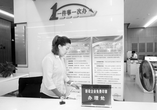 8月28日,寧鄉(xiāng)市市民之家,工作人員在新設(shè)企業(yè)免費印章辦理處忙碌。從今年7月1日起,寧鄉(xiāng)市實行新設(shè)企業(yè)首套印章免費制度。圖/王嬌嬌