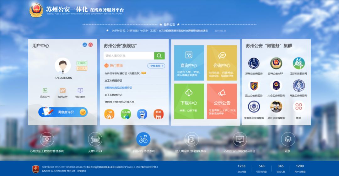 全新的“一體化平臺(tái)”以“ 用戶中心 ”、“ 蘇州公安旗艦店 ”、“ 常用功能集成模塊 ”和“ 微警務(wù)集群 ”四大版塊及頁面下方的“ 拓展式服務(wù)入口 ”構(gòu)成的一體化主界面,更加簡潔明了,各項(xiàng)主要服務(wù)功能一目了然。