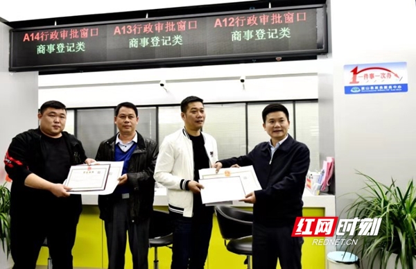 11月5日,藍山縣委書記秦志軍為永州市信一科技有限公司負責人李良勇頒發(fā)了該縣相對集中行政許可權改革的首份營業(yè)執(zhí)照