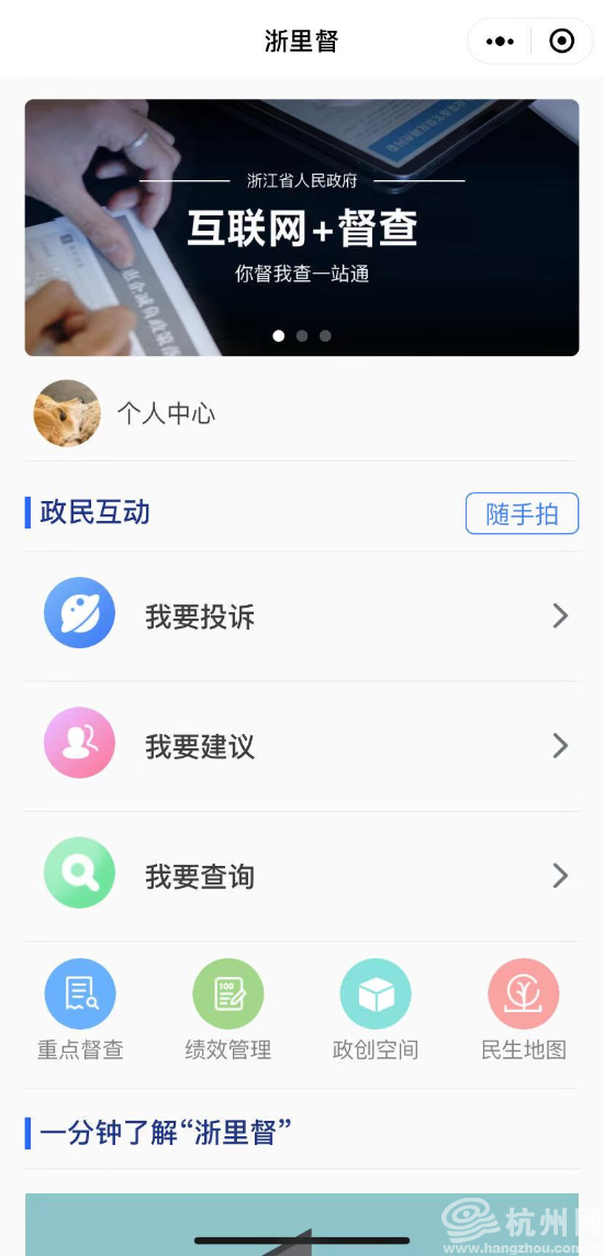 此外,浙里督微信小程序也重點設置了“政民互動”的板塊,包括“我要投訴”“我要建議”“我要查詢”,以及督查利器“隨手拍”。用戶可以通過這些功能近距離了解政府工作,揭開政務督查的神秘面紗。